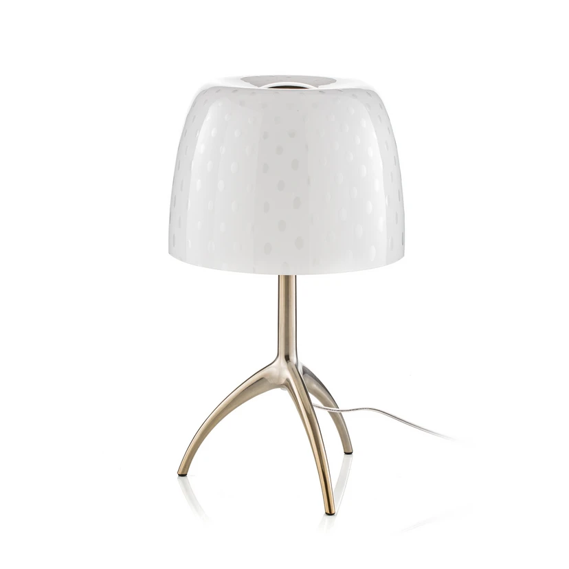 Lampa de masă Lumiere Piccola 30th Golden/Bulles On/Off este o lampă de masă unică a renumitei mărci Foscarini. Această ediție specială sărbătorește 30 de ani de existență a unui clasic al designului, care a decorat deja multe case cu eleganța sa atemporală. Lampa de masă combină sticla și aluminiul într-o frumoasă culoare opală și aurie, pentru un aspect modern și elegant. Pentru prima dată, sticla suflată manual are un decor tridimensional, care conferă o nouă dimensiune designului clasic.