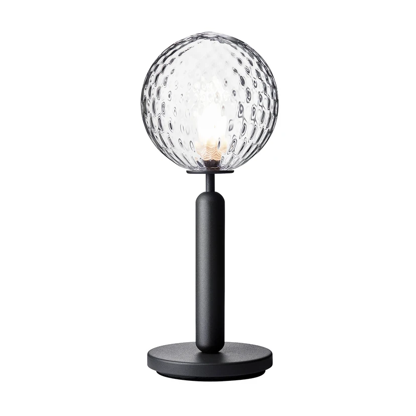 Lampa de masă Miira este disponibilă cu două tipuri diferite de sticlă - sticlă optică transparentă și sticlă opalină albă mată. Ca un contrast, baza lămpilor este din metal Rock Grey lăcuit cu pulbere.